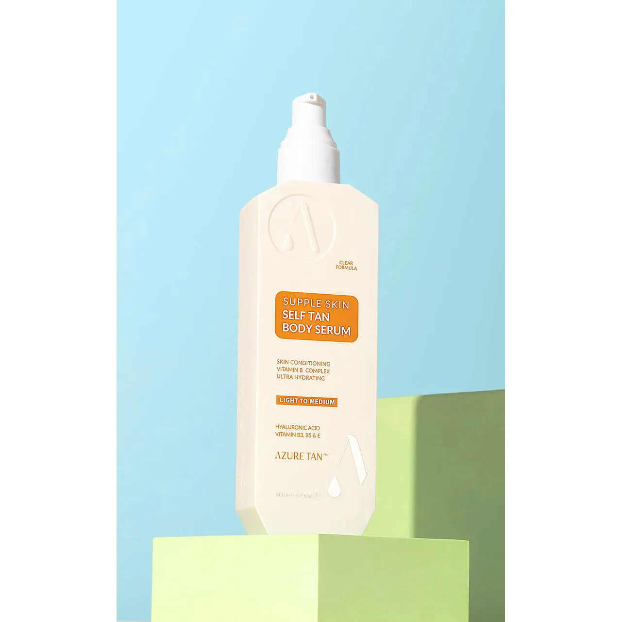 Azure Tan Supple Skin Body Tanning Serum is designed to lock in moisture, leaving the skin hydrated, plump and feeling velvety soft, whilst providing a glowing tan.