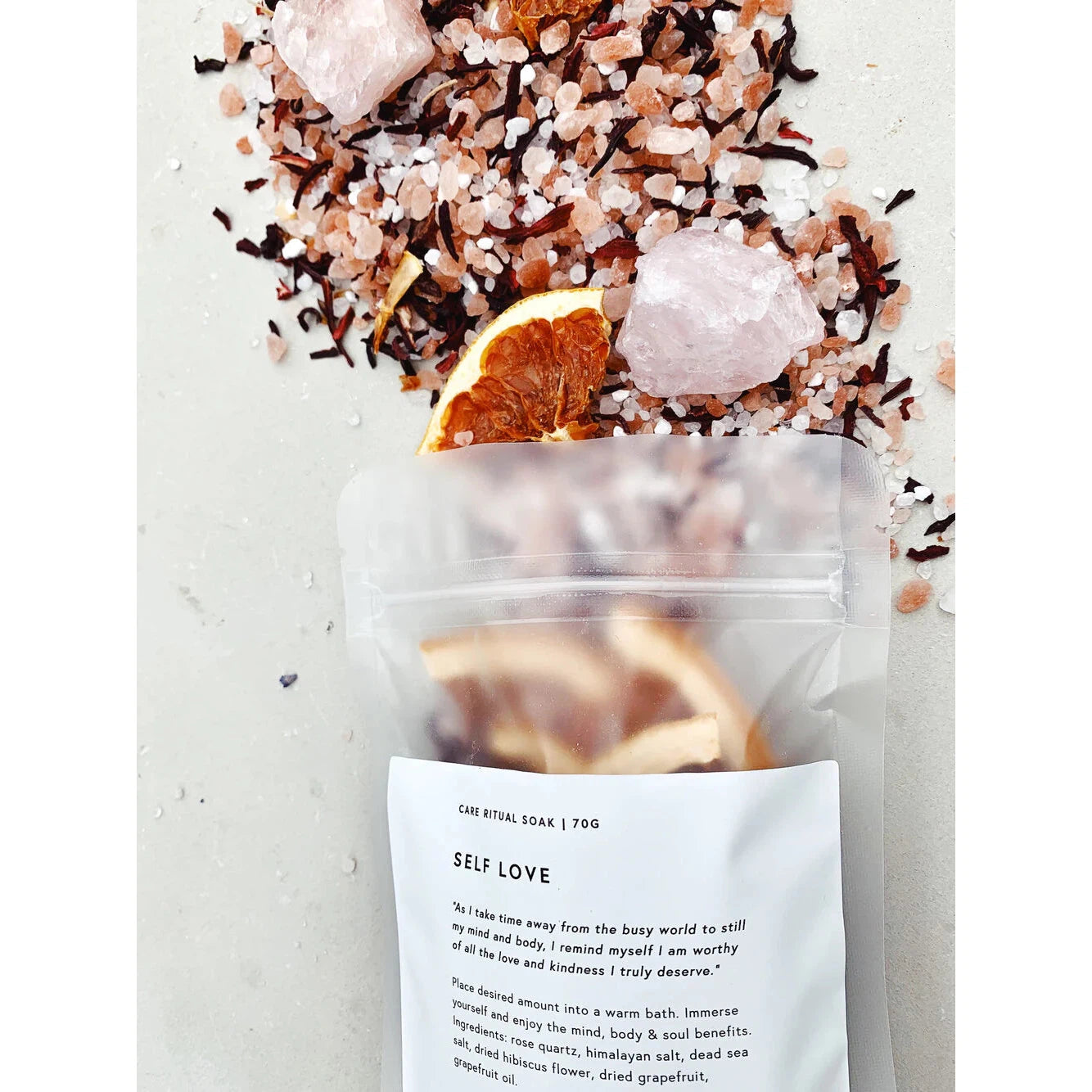 Ingredients: rose quartz, himalayan salt, dead sea salt, dried hibiscus flower, dried grapefruit, grapefruit oil.
